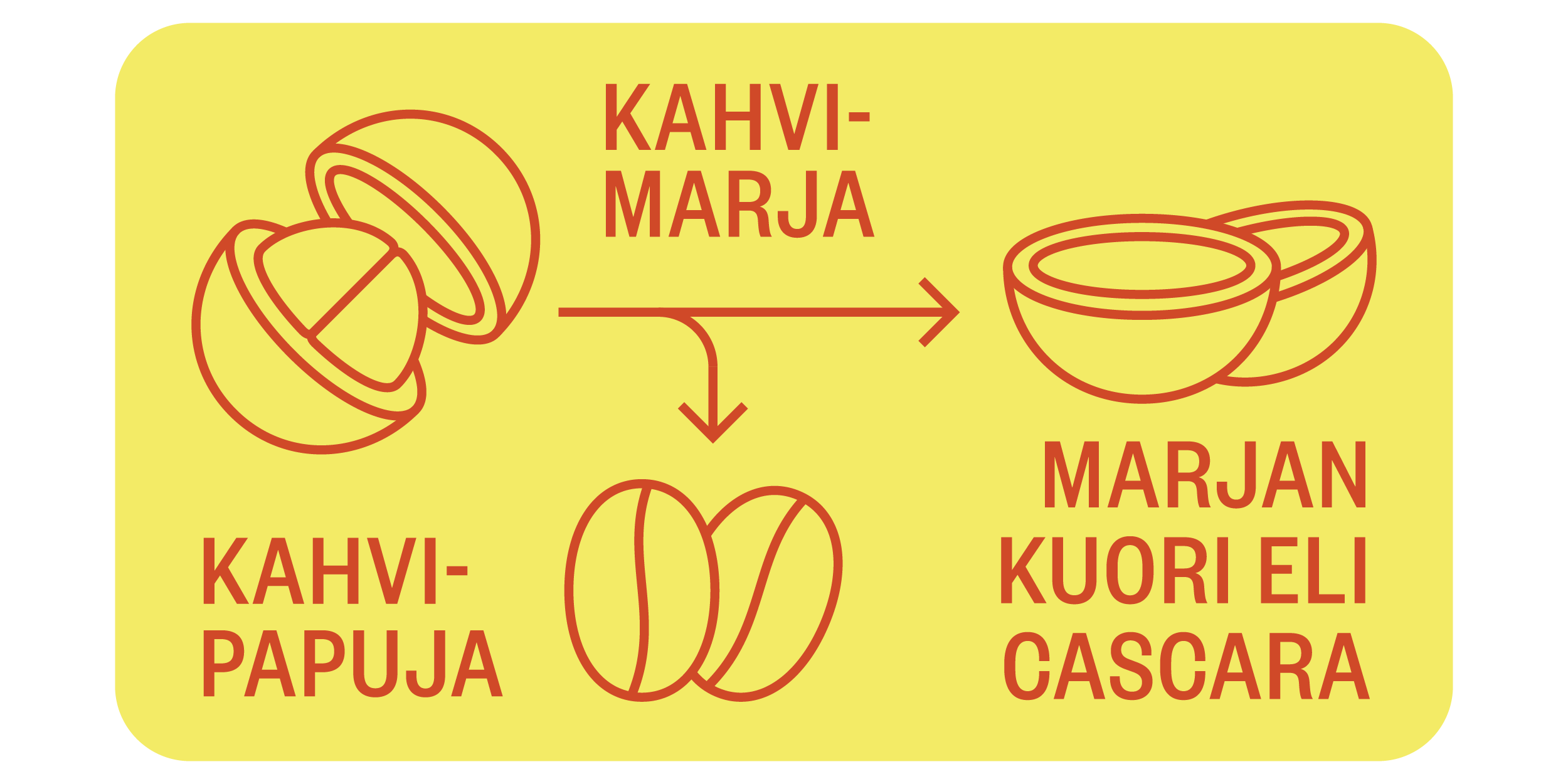 Harva tietää, että kahvi on oikeasti marja. Kahvimarjan sisällä on yleensä kaksi kahvipapua, jotka eri prosessointimenetelmillä irrotetaan kahvimarjan hedelmälihasta ja kuoresta. Sen jälkeen pavut kuivataan ja kuljetetaan meille paahdettavaksi. Kahvimarjan kuori eli cascara, on maailmanlaajuisesti valtavan kokoinen sivuvirta, joka on pitkään jäänyt hyödyntämättä elintarviketeollisuudessa.