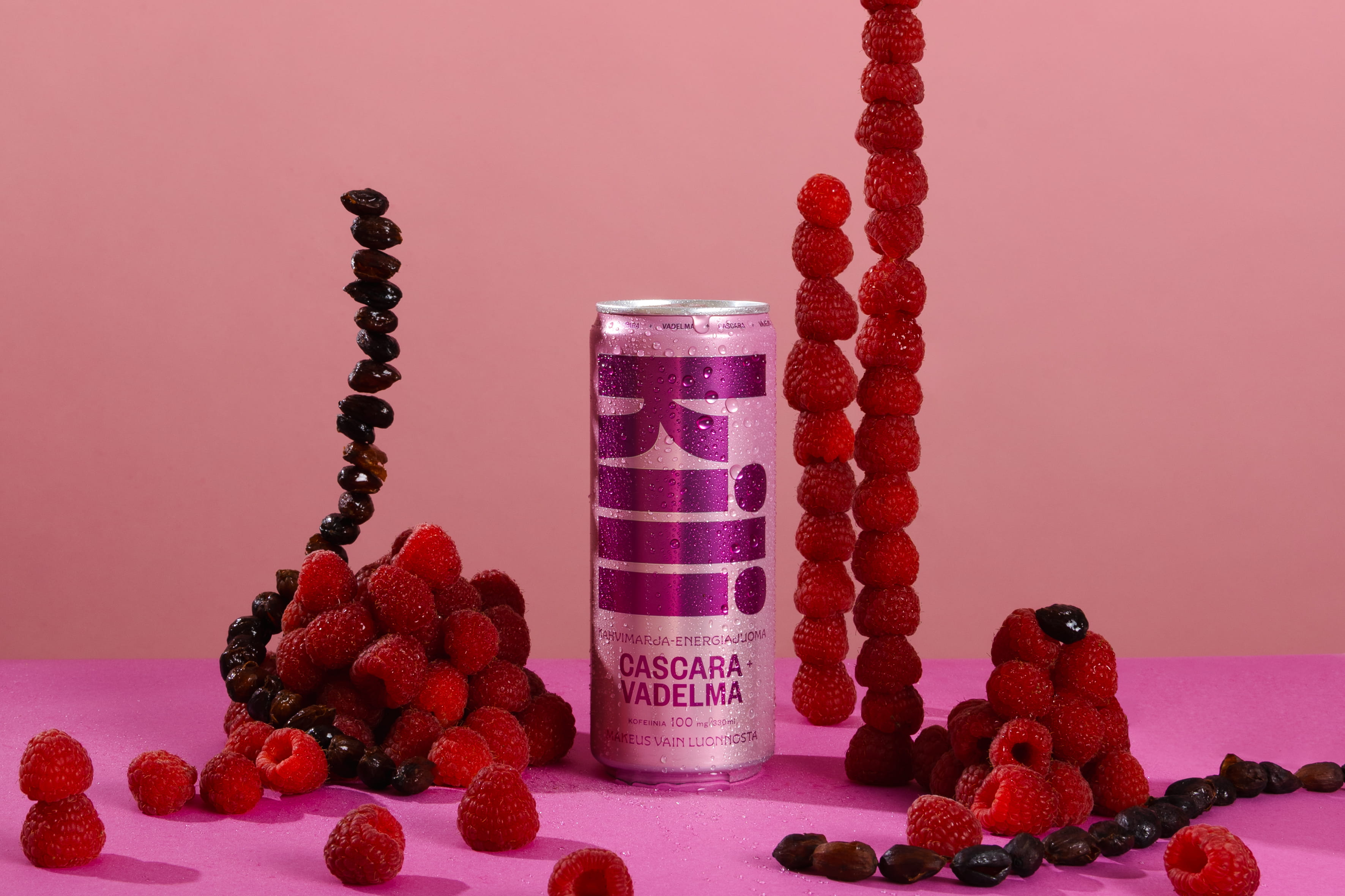 Vesi, rypäletäysmehu tiivisteestä (12,9%), cascara-uute (kahvimarjan hedelmälihauute) tiivisteestä (10%) (muu kuin EU), vadelmatäysmehu tiivisteestä (9,1%), hiilidioksidi, luontaiset aromit, happamuudensäätöaineet (sitruunahappo, natriumsitraatit), C-vitamiini, luontainen kofeiini vihreistä kahvipavuista, makeutusaine (Steviasta saatavat stevioliglykosidit).
